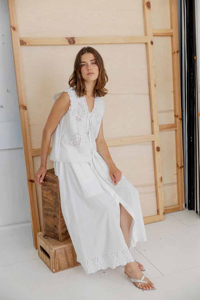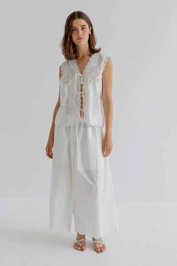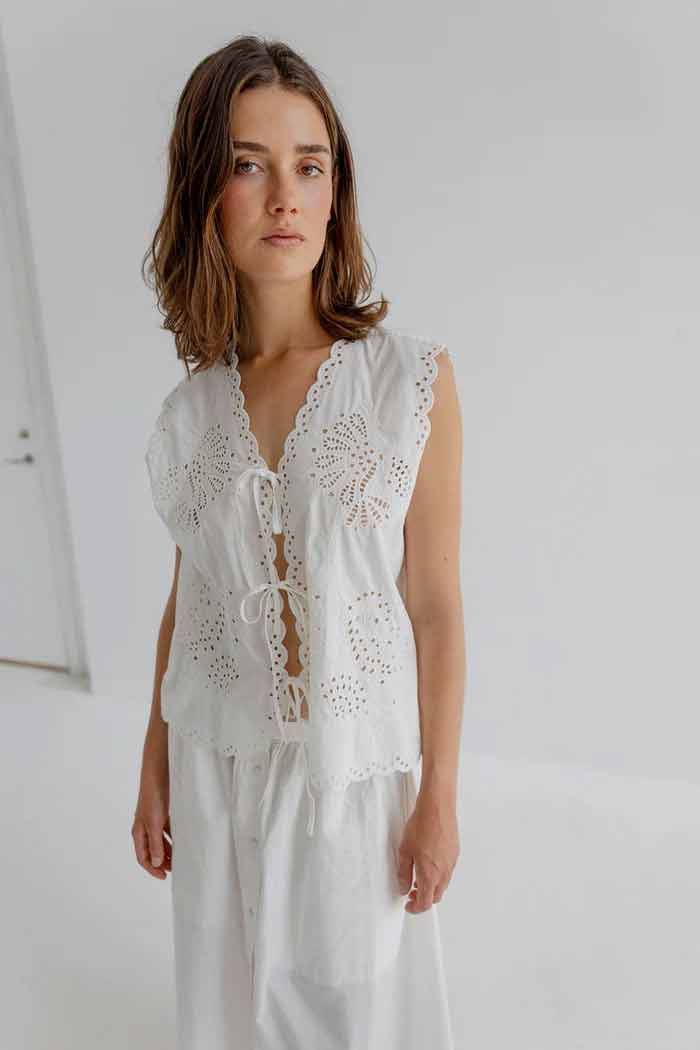 Hope is a lightweight top in our basic collection of organic cotton. The top has a sleeveless silhouette with a deep V-shaped neckline and delicate tie closures at the front. It features detailed embroidery throughout and scalloped edges that add a soft feminine finish. The fit is relaxed and airy, making it easy to style for everyday wear.