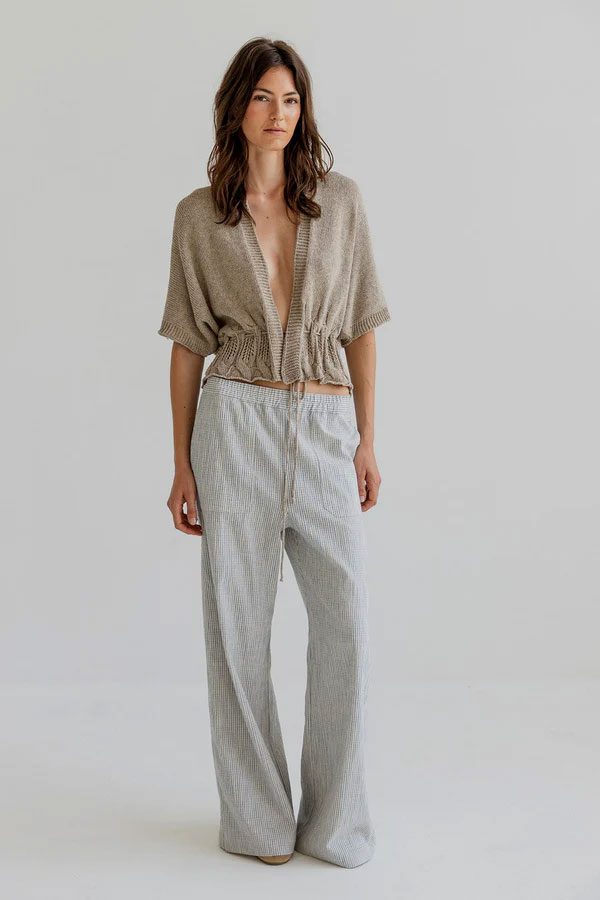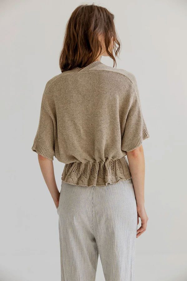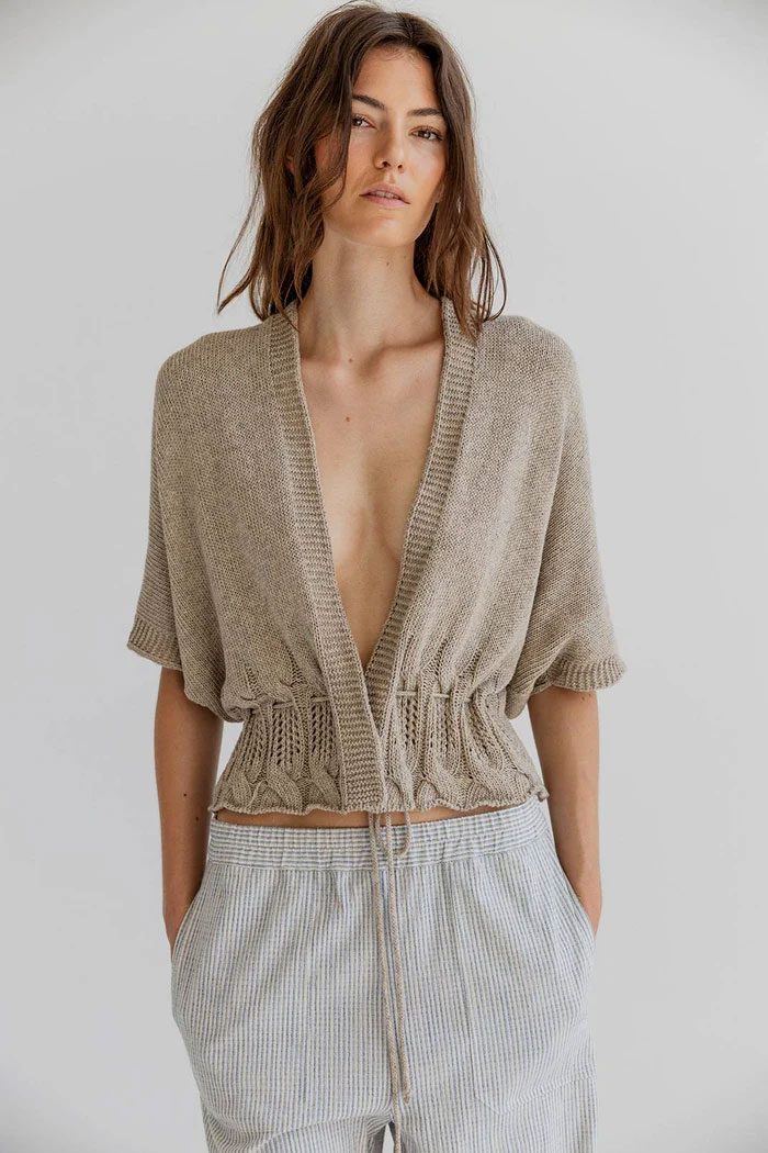 VINNIE is a short-sleeved summer cardigan with a deep V-neck and drawstring waist. The top is crafted in a soft textured knit with openwork details and wide rib trims.