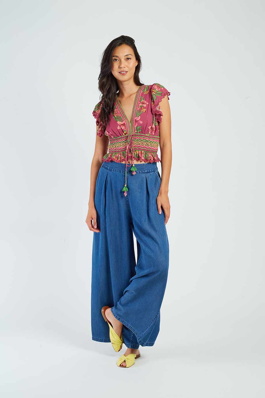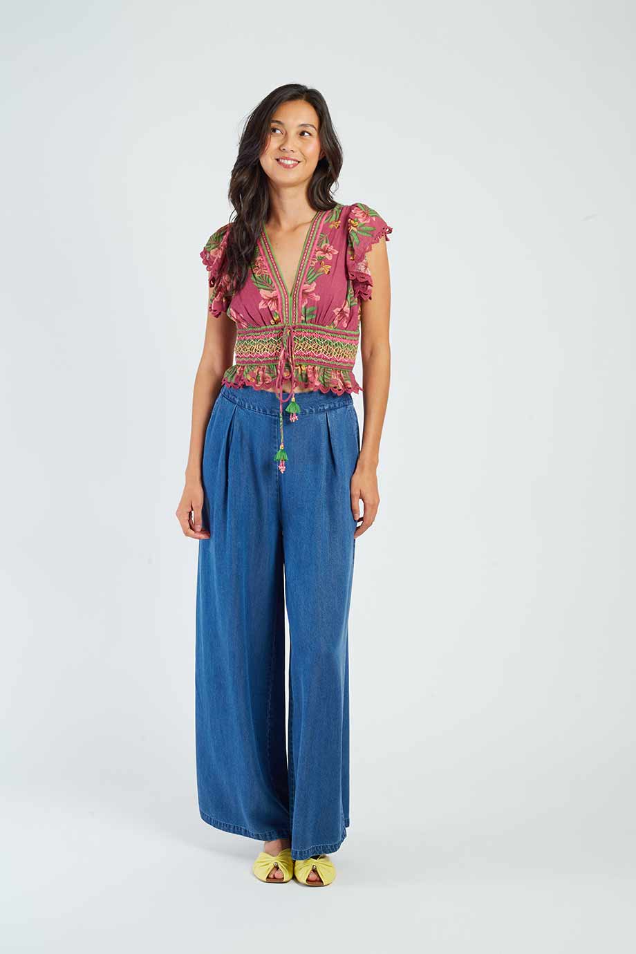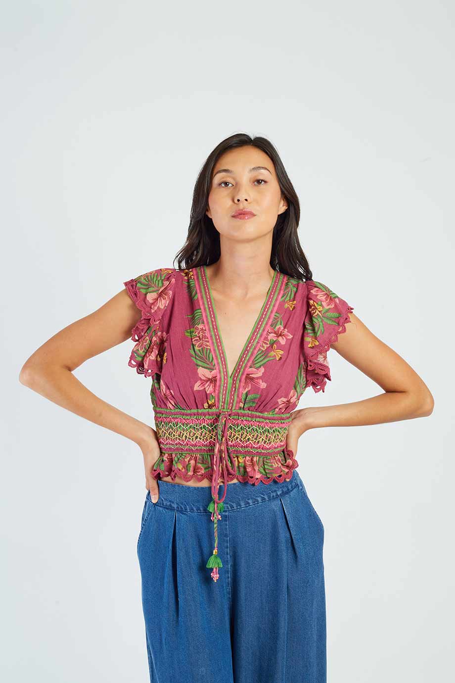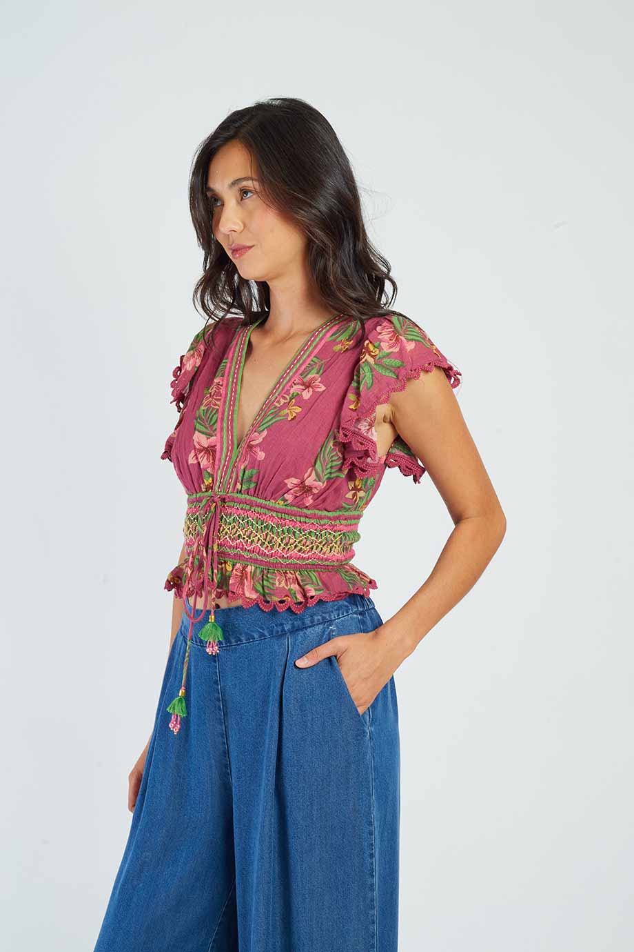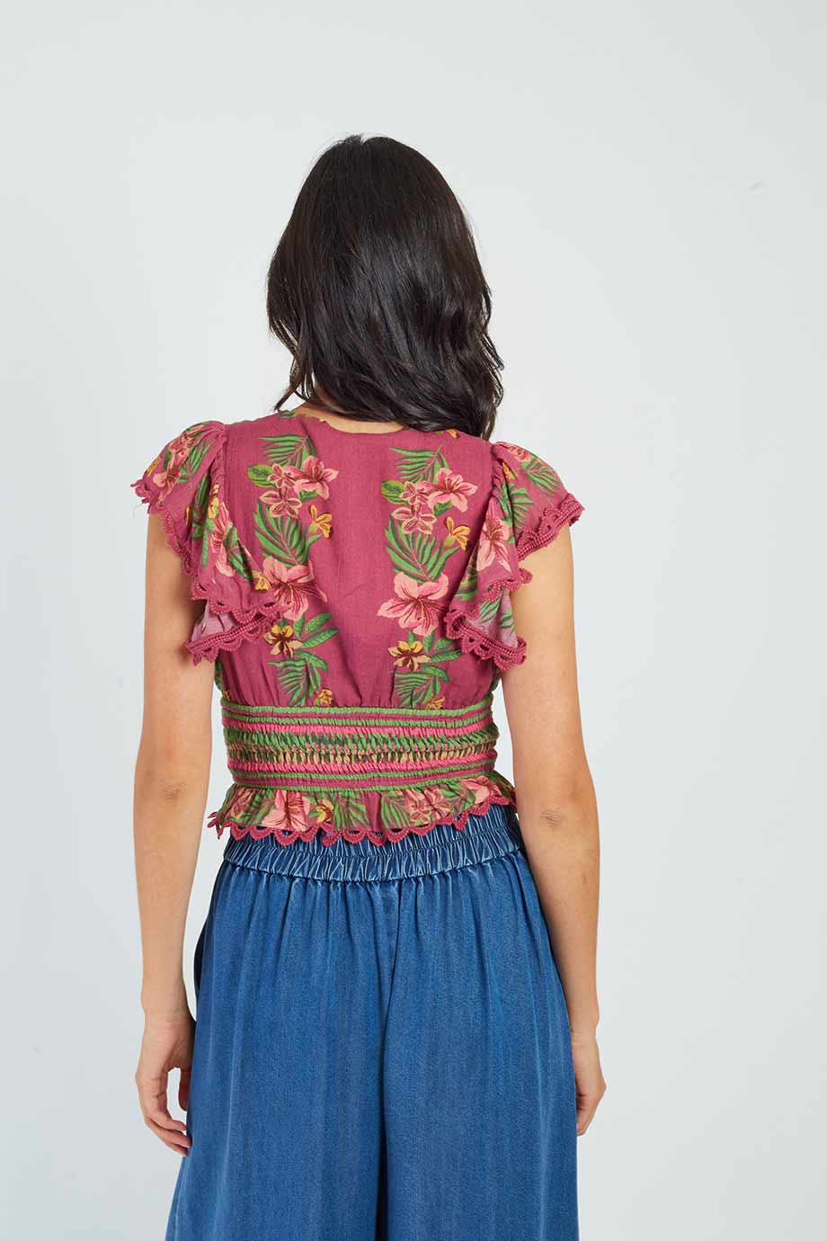 Short-sleeved blouse with a deep v-neck, adorned with a tropical floral print.
