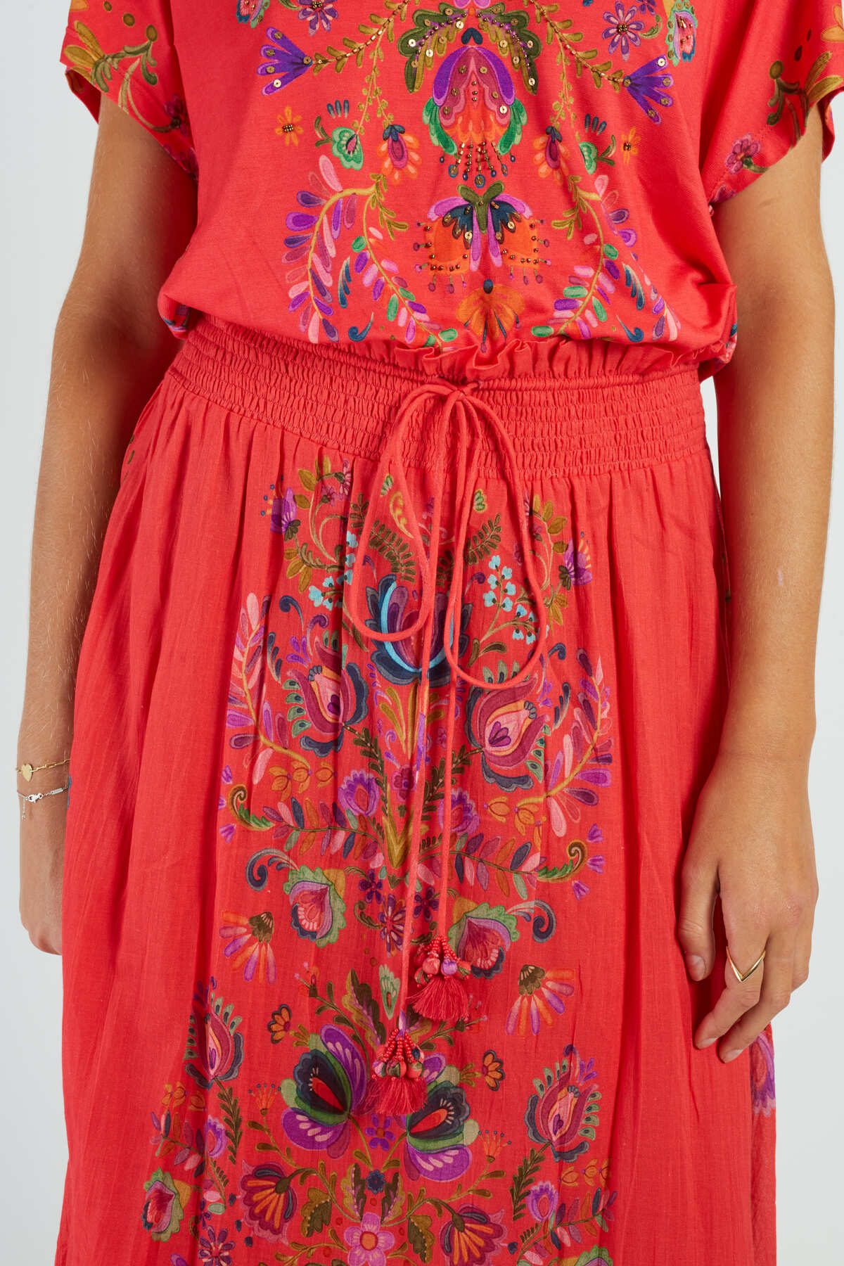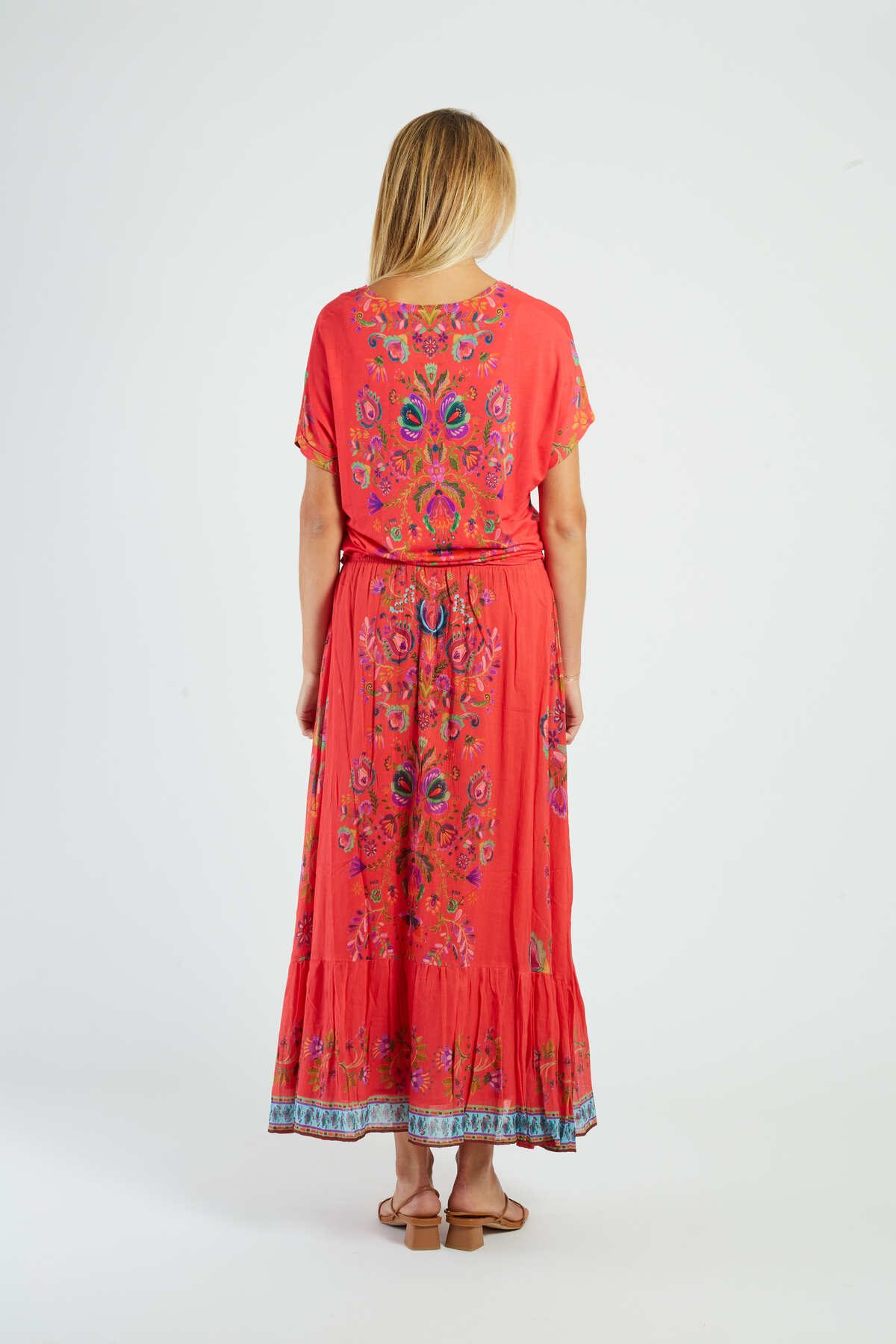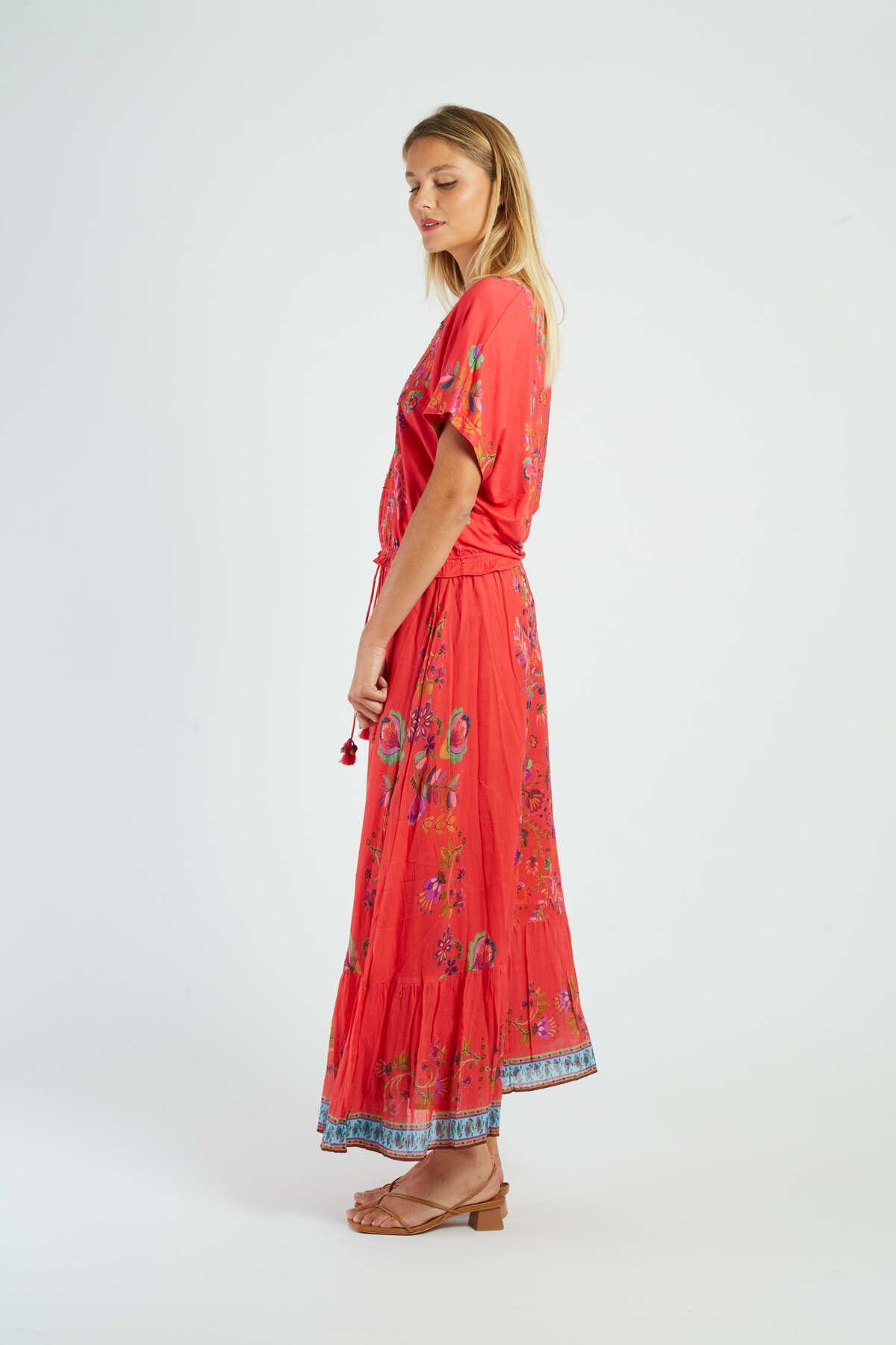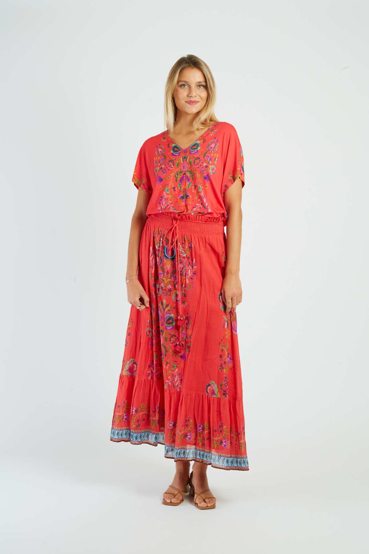 Maxi skirt with floral print, A-line silhouette. Elasticated waistband for a comfortable, relaxed fit. Vibrant, multicolored floral pattern throughout. Lightweight, flowing fabric with a slight stretch. Functional side pockets for convenience. Ankle-length hemline.