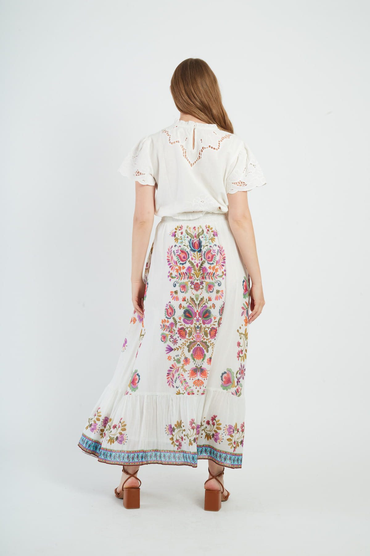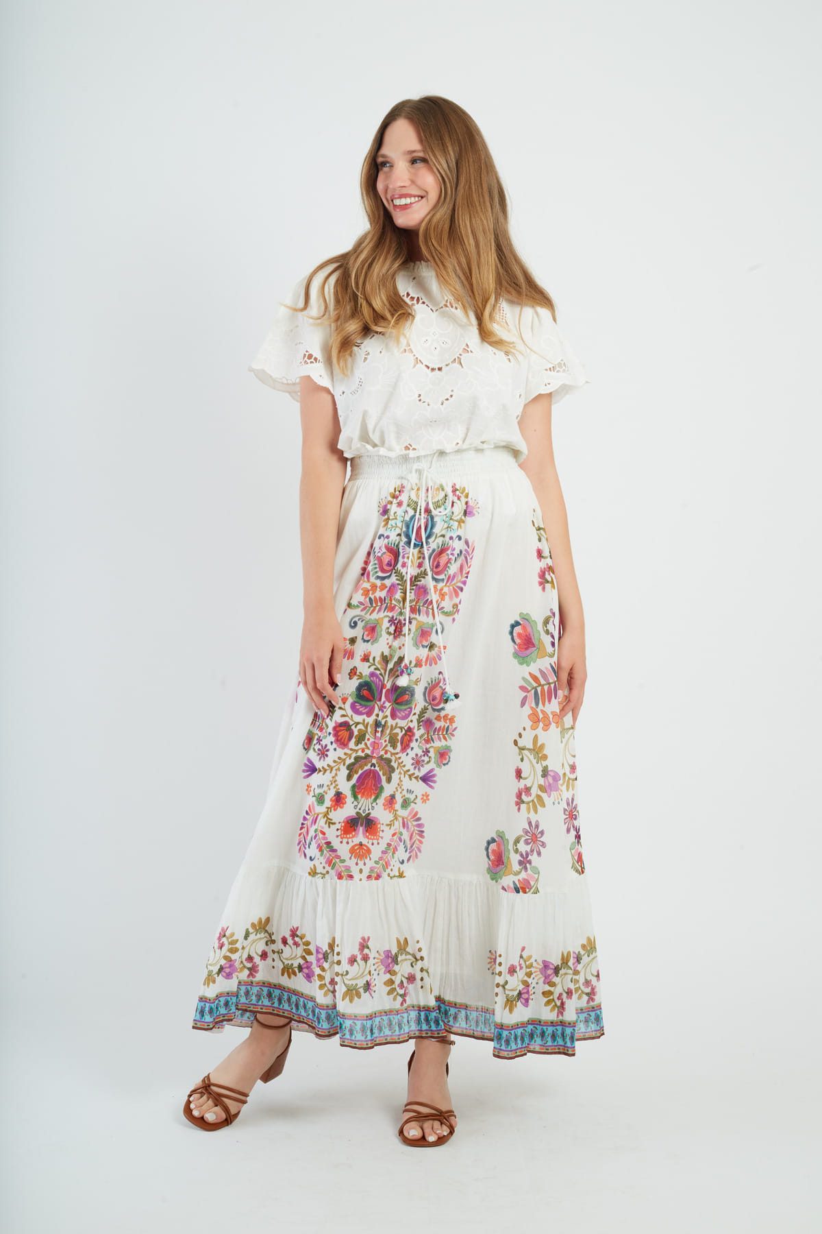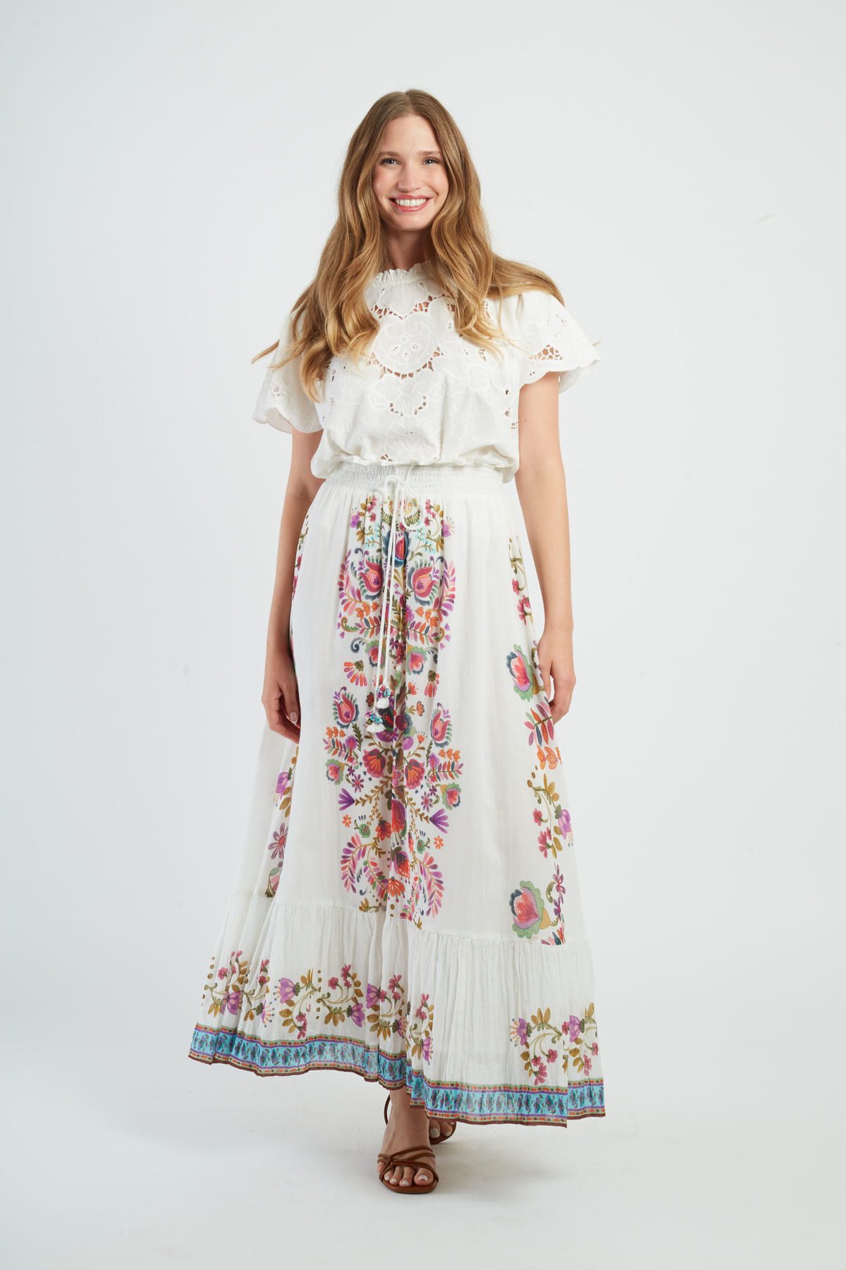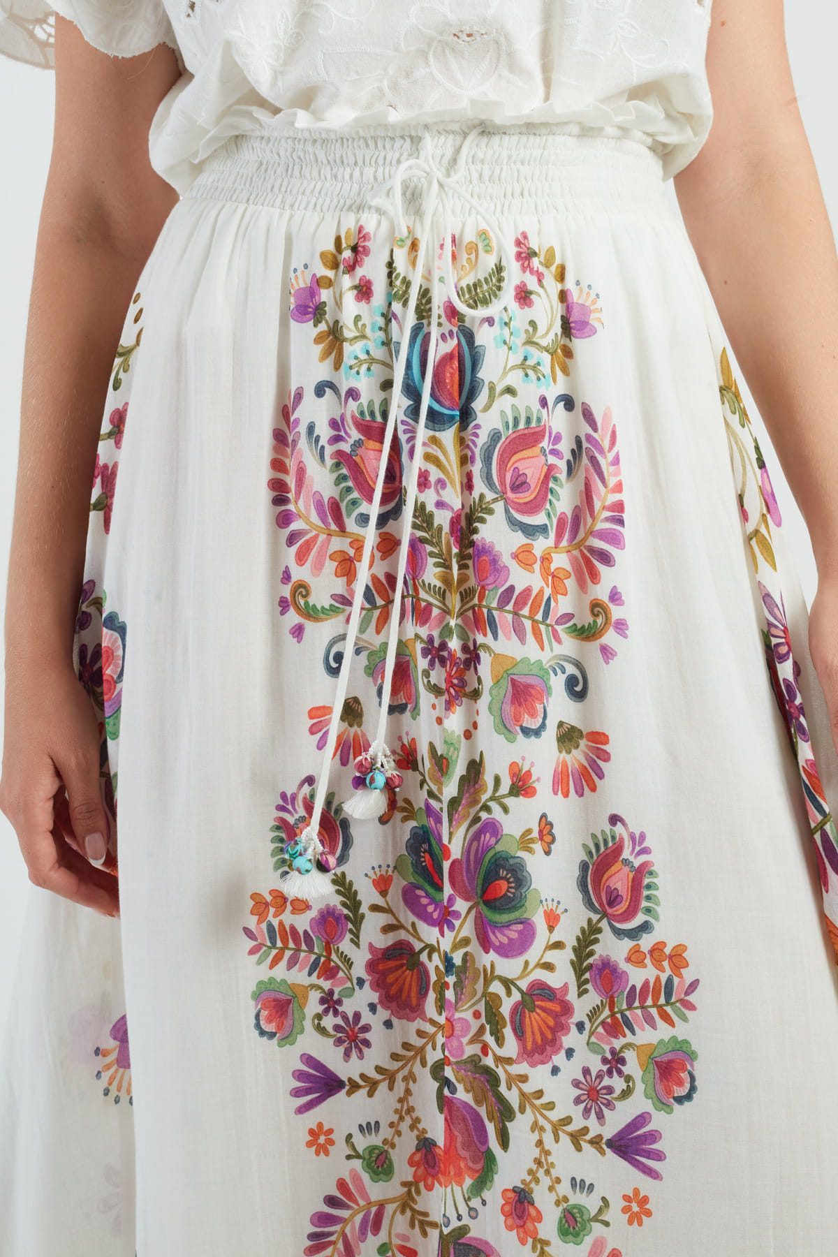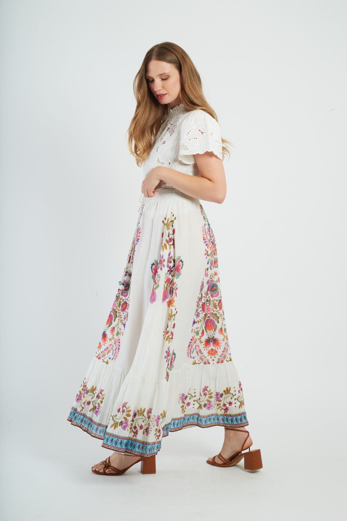 Maxi skirt with floral print, A-line silhouette. Elasticated waistband for a comfortable, relaxed fit. Vibrant, multicolored floral pattern throughout. Lightweight, flowing fabric with a slight stretch. Functional side pockets for convenience. Ankle-length hemline.