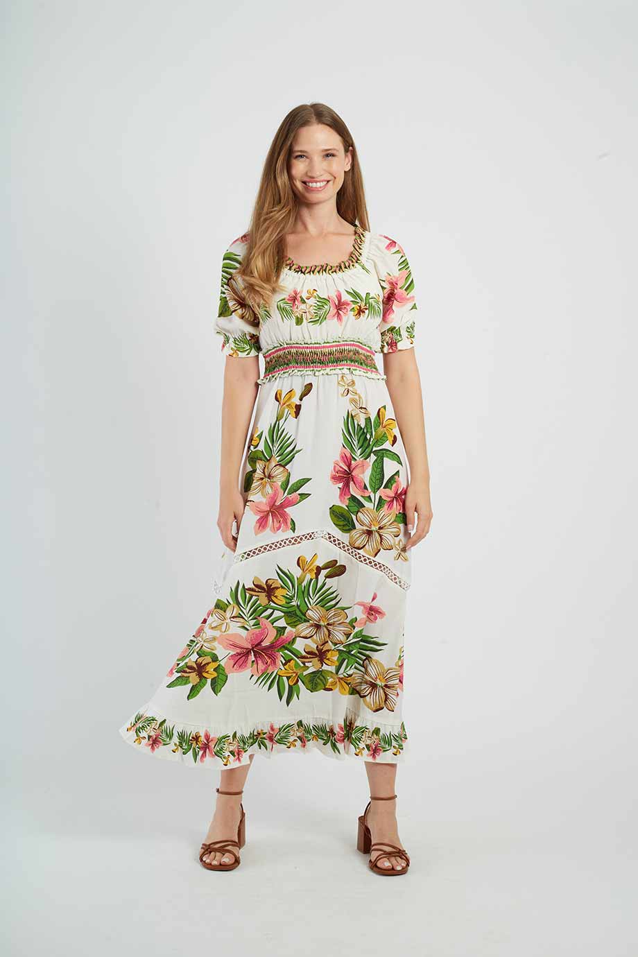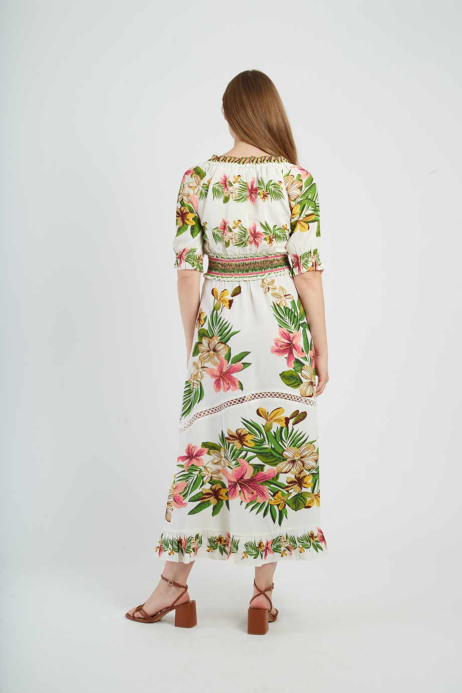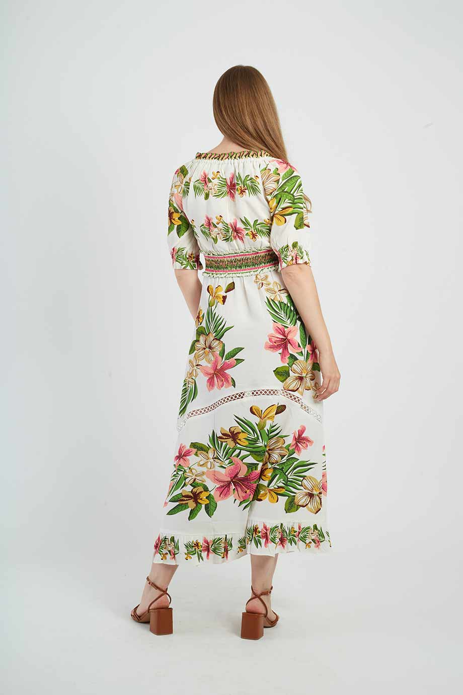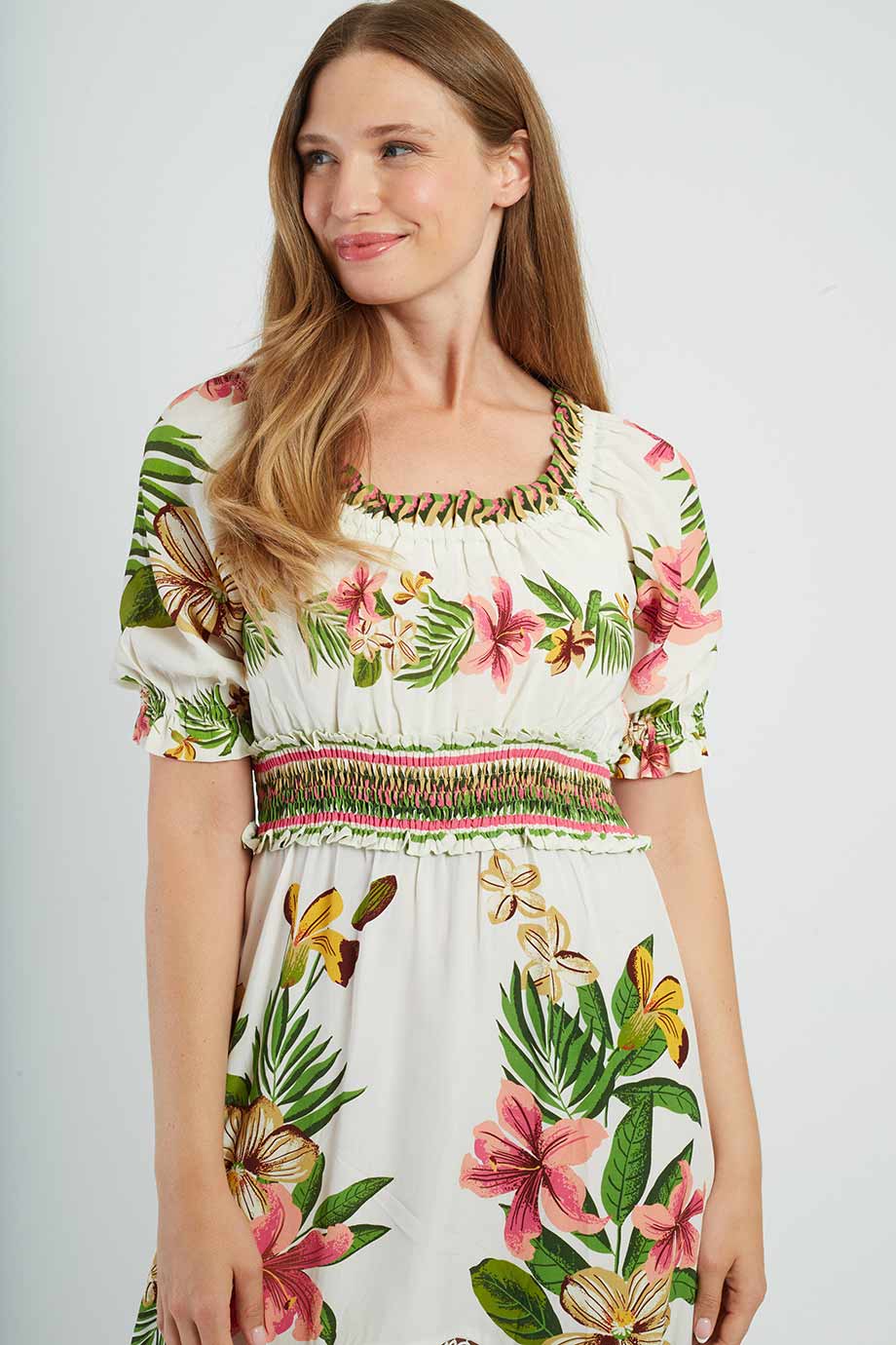 Long, short-leeved dress with a Bardot neckline, adorned with tropical floral prints.