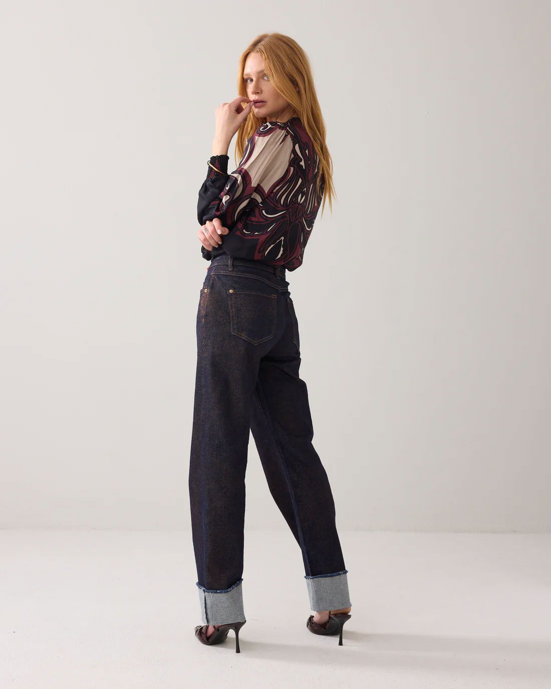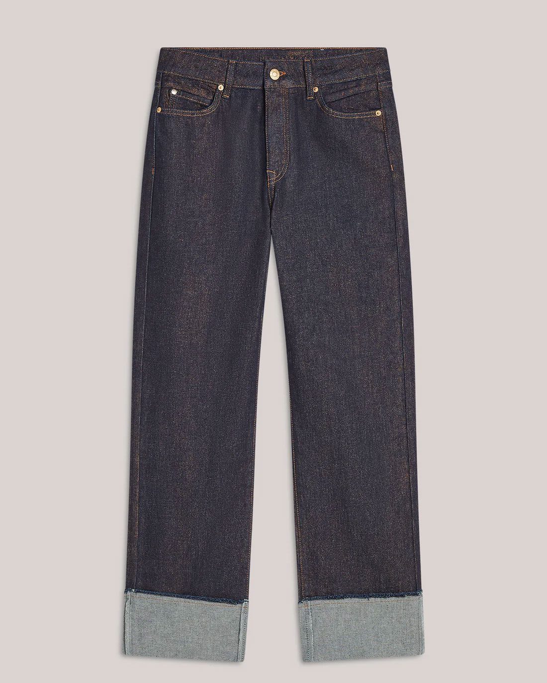 Straight fit Sarin jeans made from stretch denim with foil coating with a mid-rise waist. The trousers have a wide turned-up hem and a raw edge trim.