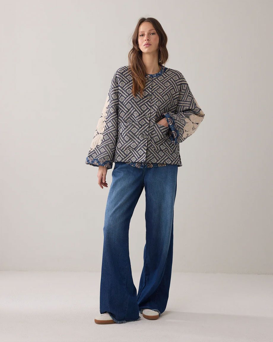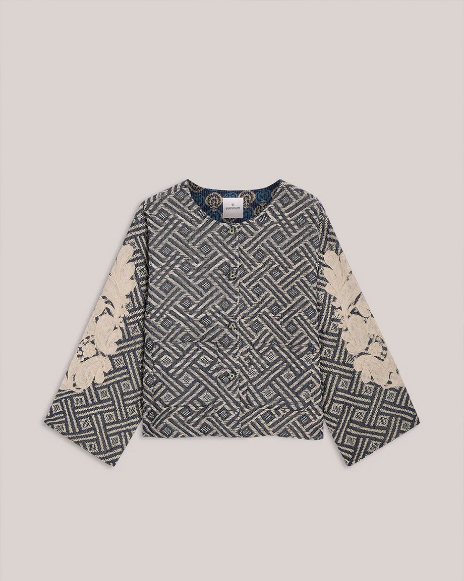 Loose-fitting reversible jacket with a rich jacquard on one side and a block print on the other. The jacket has patch pockets, small side slits and is finished with fine embroidery on the sleeves and back. The jacket pairs nicely with the matching tote bag 8s1078.