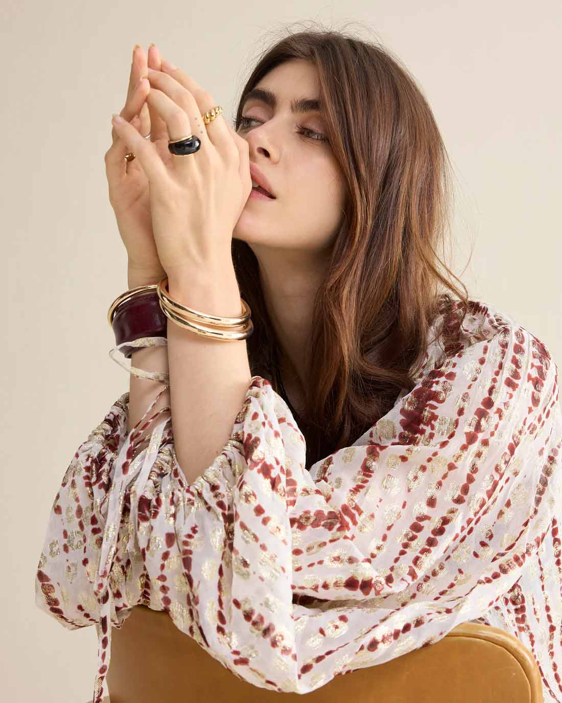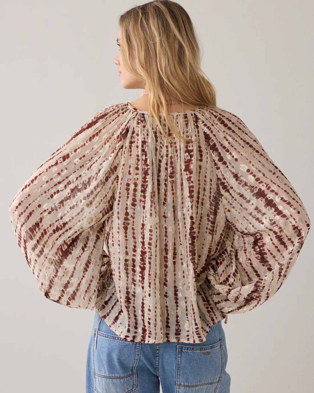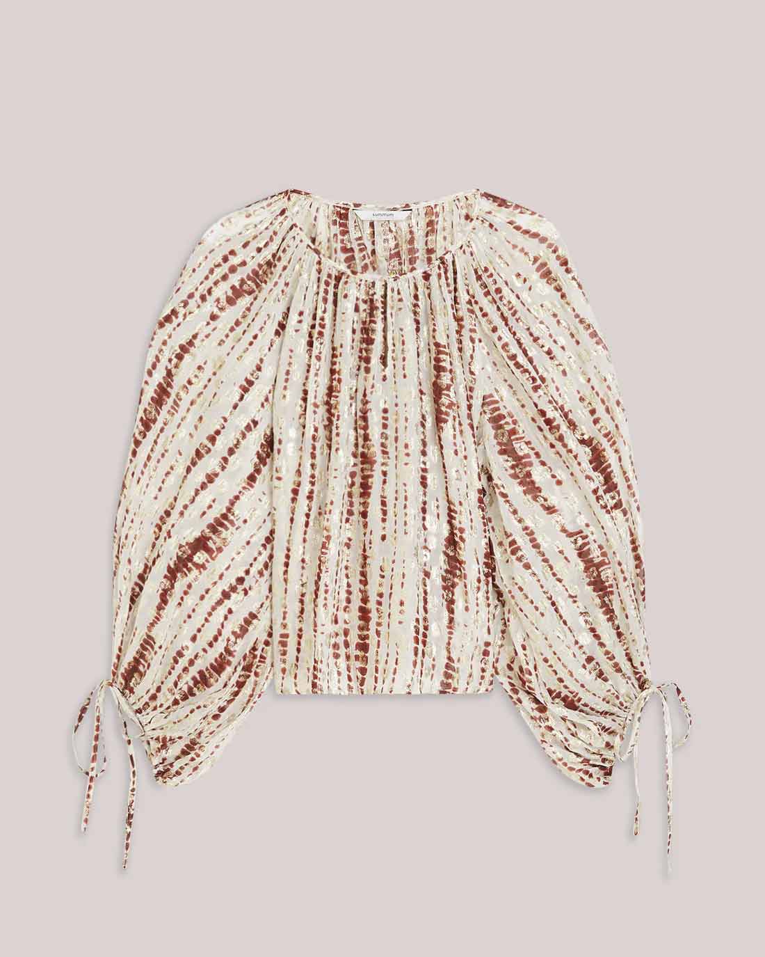 Top in light, sheer viscose georgette – a crêpe fabric with a slightly crinkled surface – in tie dye with metallic details. The top has a slit with a gold-tone button and large balloon sleeves with adjustable drawstrings.