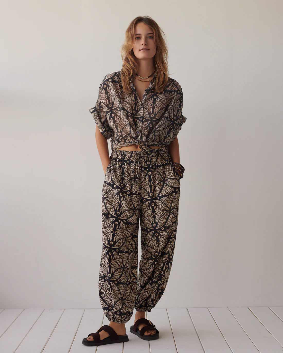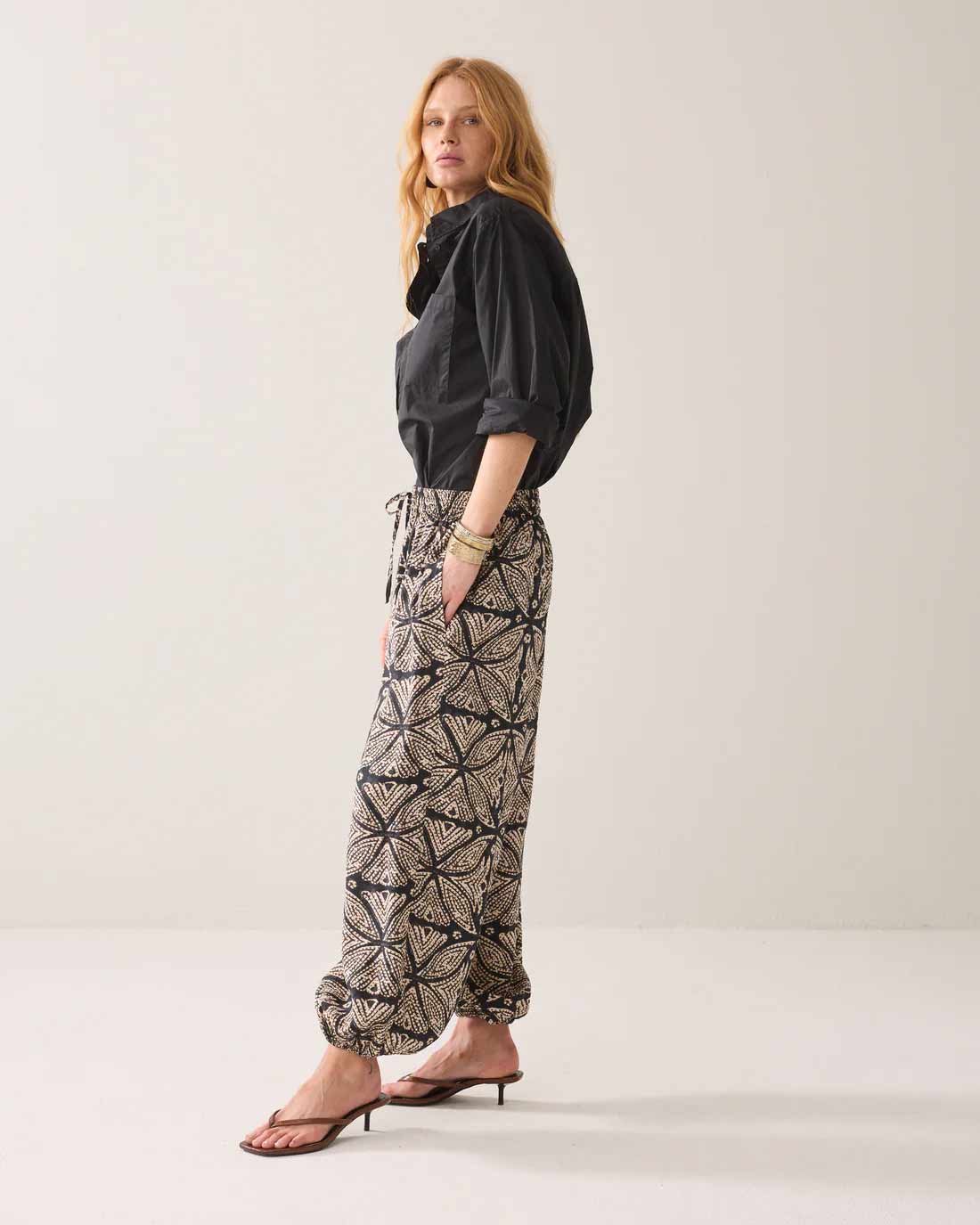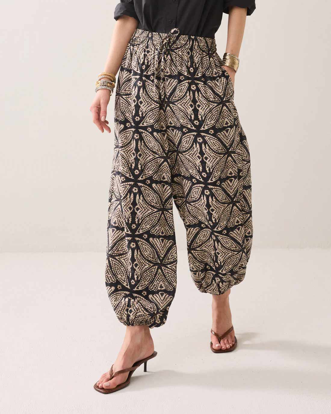 Harem trousers with an eye-catching print. The trousers have an elasticated waistband with drawstring fastening all around, a slightly lowered crotch and elastic at the bottom of the legs.