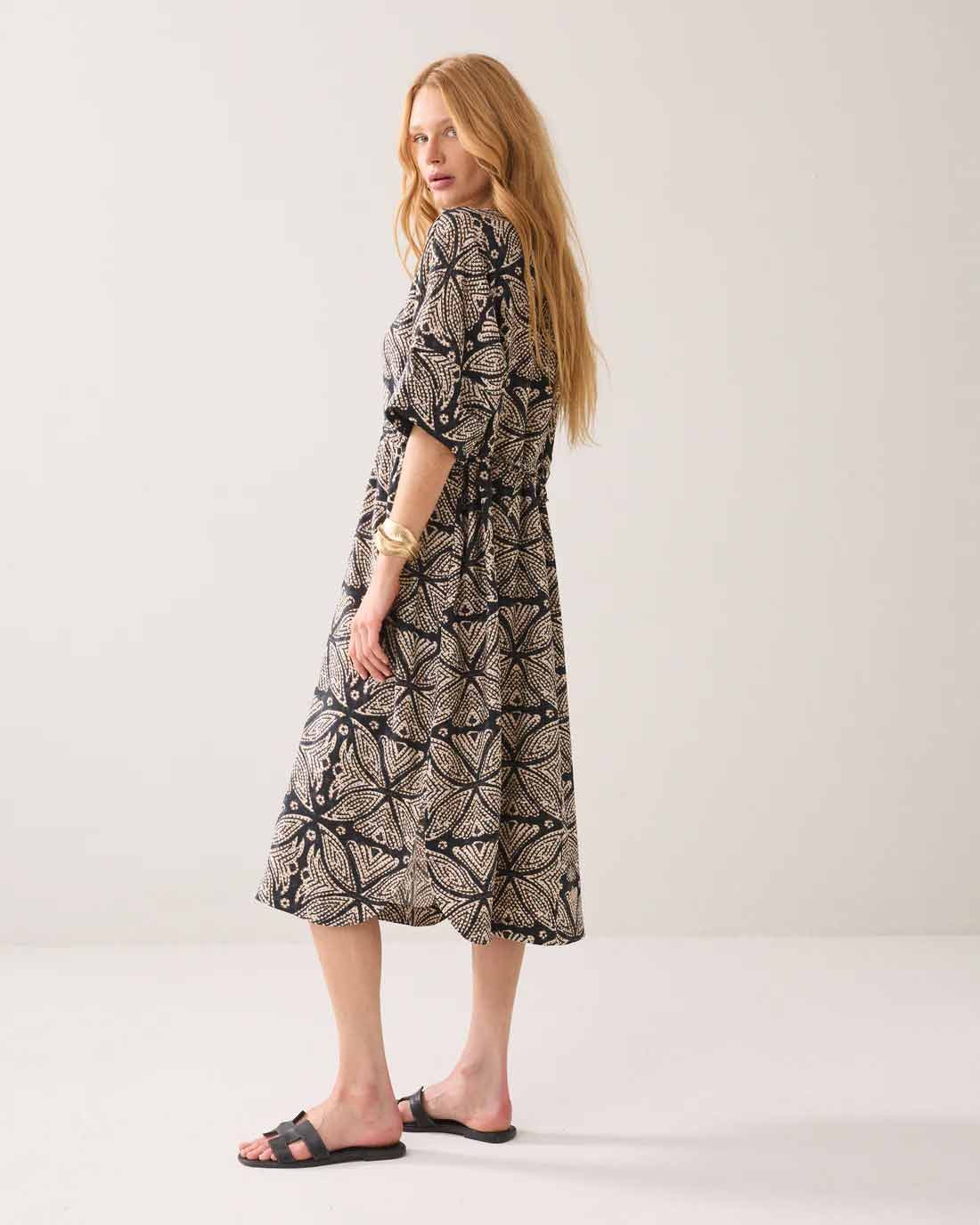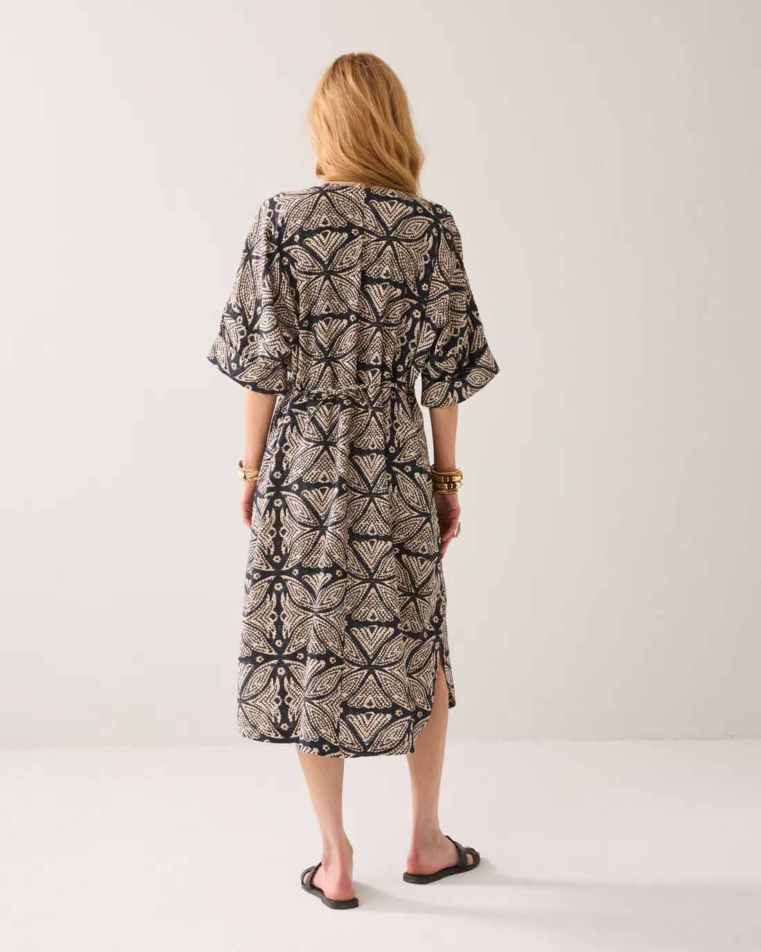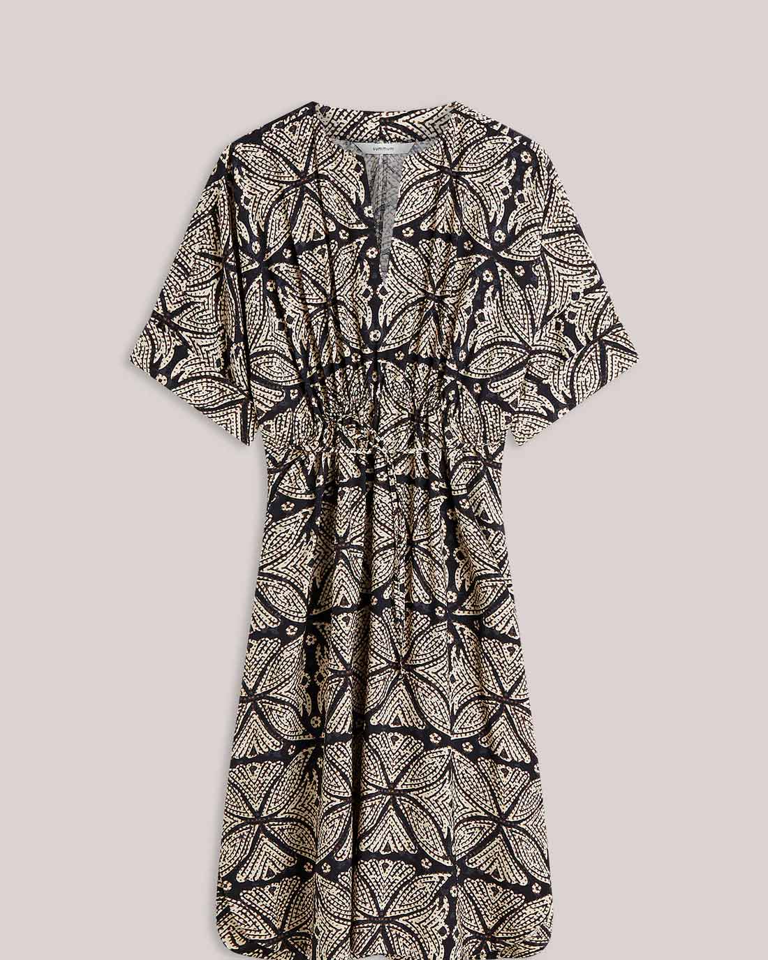 Dress in a supple viscose blend with a length just above the knee. The dress has a deep slit and can be worn both loose-fitting and more fitted with a drawstring, to the front or back.
