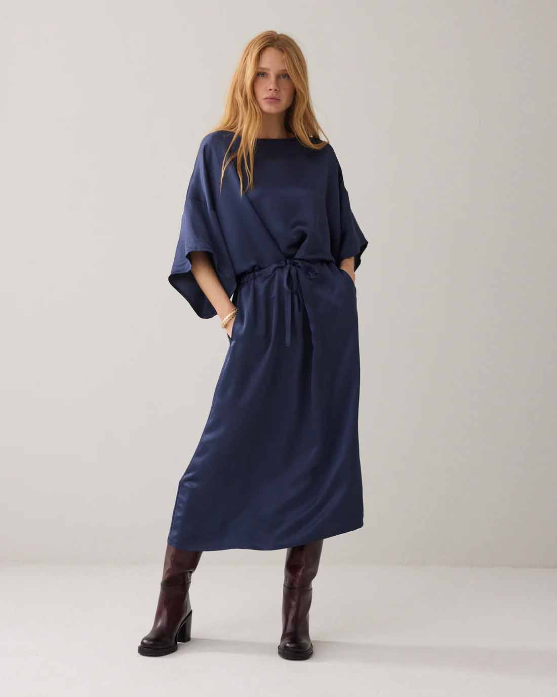 Dress in loose-fitting heavy silky fabric with a slight sheen. The dress has a boat neckline with hemmed trim, wide straight sleeves with a lowered shoulder seam and a gathered waist with cord tie in a tunnel.