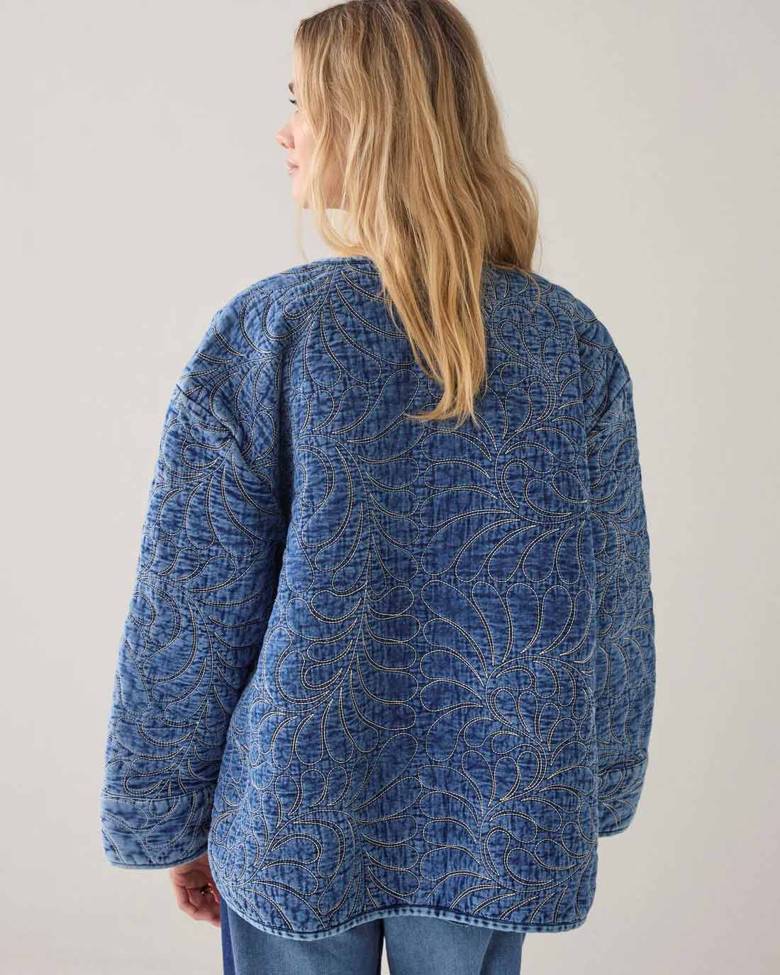 Transitional jacket in quilted cotton satin in a leaf pattern. The jacket has a straight fit and is finished with thin denim cuffs.