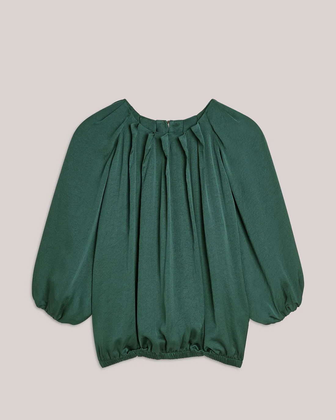 Reversible top in shiny satin fabric with a pleated neckline and visible pleated stitching. This item has raglan sleeves with inward-folded elasticated cuffs. The top can be worn with the slit and button fastening at the front or back.
